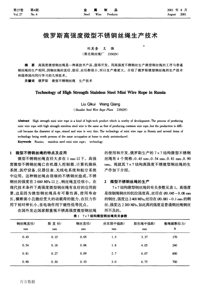 俄罗斯高强度微型不锈钢丝绳生产技术